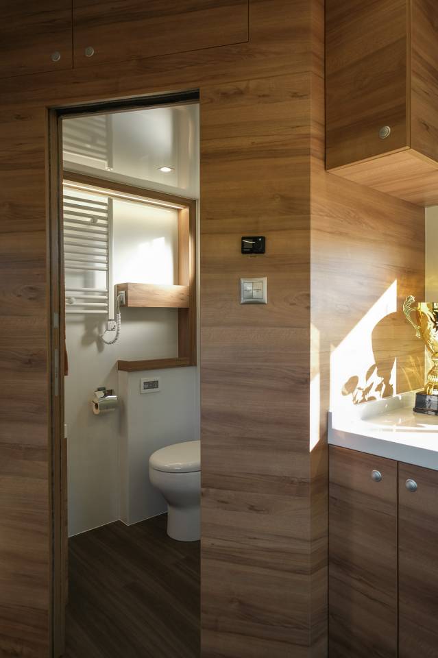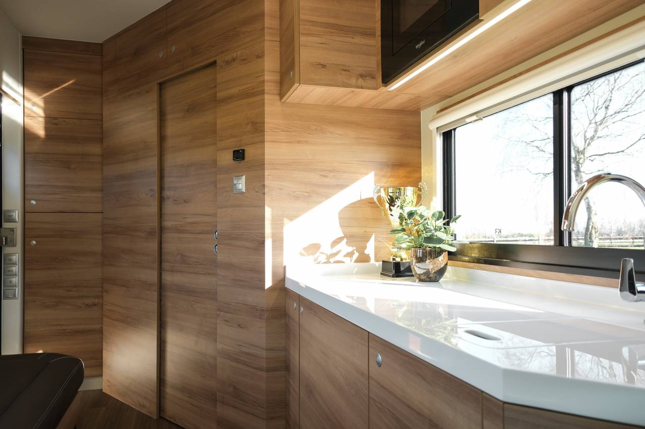 - TV, routeur 4G, centre de controle, climatiseur Dometic, compartiment de rangement au dessus de la SDB, murs recouverts d'un revêtement en cuir artificiel.